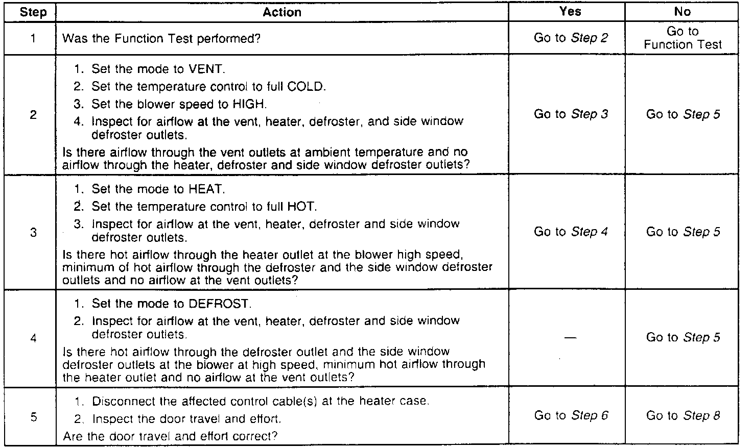 The table shown represents the design intent for the air distribution from the air outlets in each control setting and the percent of the air flow which should be distributed by the system to the outlets. By design, air should be flowing from the Air Outlet Vents (6 and 10) at all times, except for the Defrost mode.