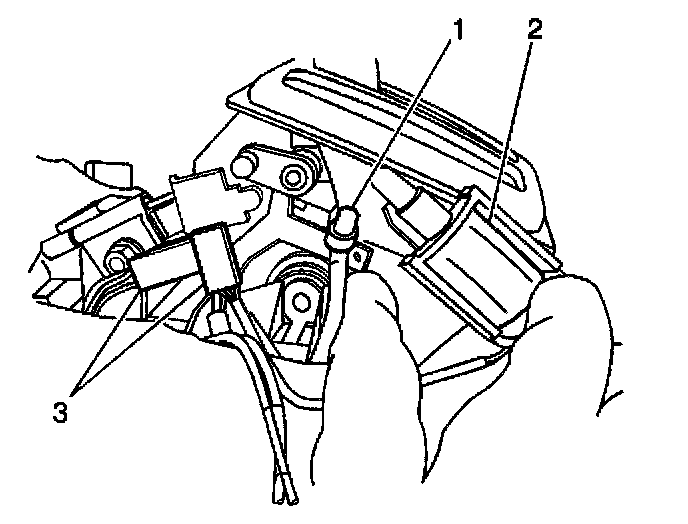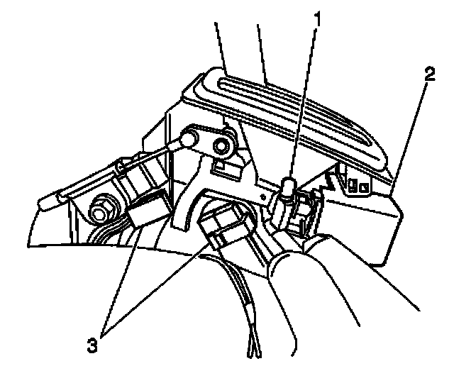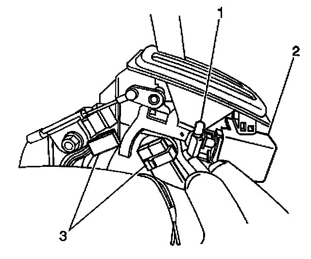 3. Remove the shift lock solenoid electrical connector (3) from under the carpet and disconnect.