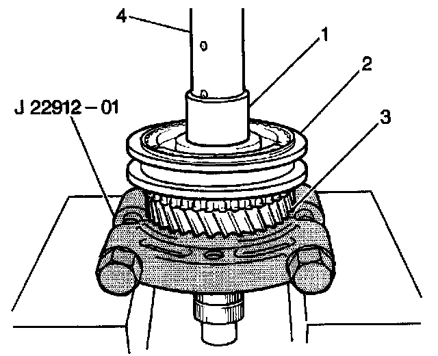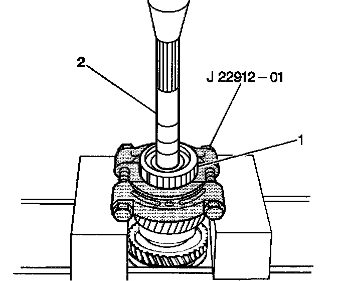 7. Use the J 22912-01 and a press arbor in order to remove the main shaft rear bearing from the main shaft (1).