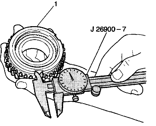 29. Use the J 26900-7 in order to measure the key slot width of each synchronizer ring (1). The maximum synchronizer key slot width is 10.1 to 10.4 mm (0.397 to 0.409 inch). If the synchronizer ring key slot width exceeds the specification, replace the synchronizer ring.