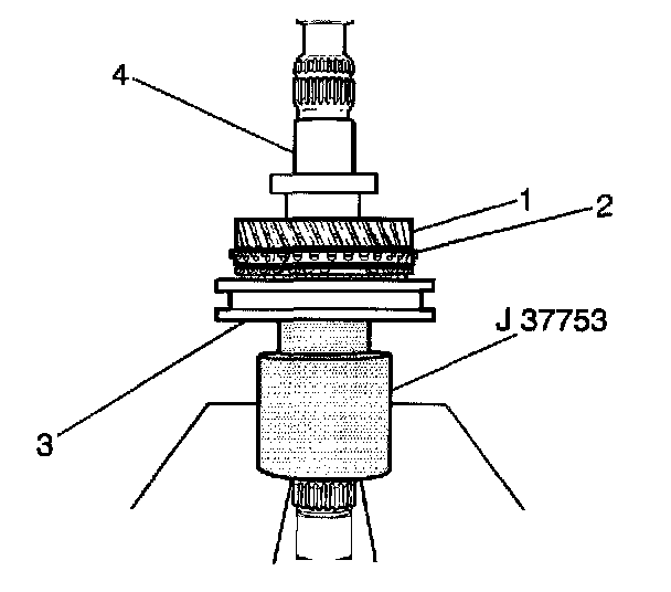 5. Use the J 37753 and a press arbor in order to install the low speed sleeve (3) and hub assembly onto the main shaft (4).