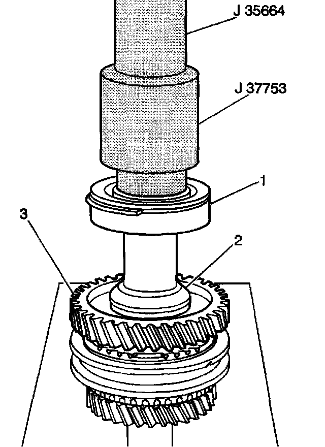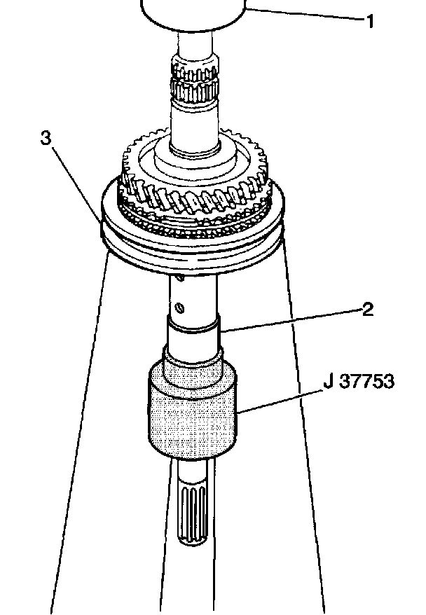 17. Use the J 37753 and the J 35664 in order to install the reverse sleeve and hub assembly (3) onto the main shaft. Gently tap in order to install the reverse sleeve and hub assembly (3).