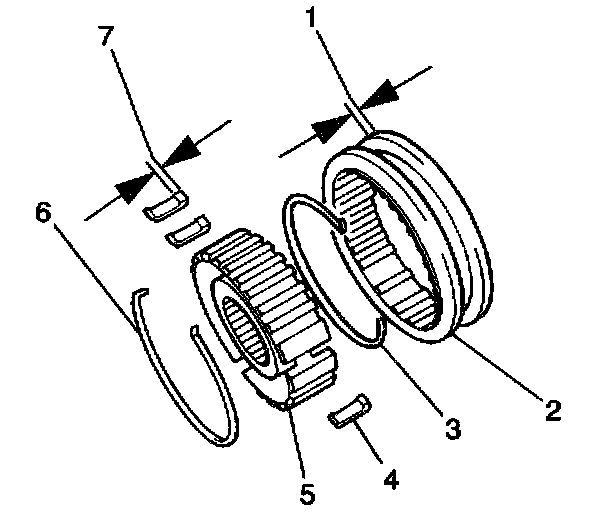 11. Connect the reverse synchronizer springs (3, 6) and the three synchronizer keys (4) to the reverse synchronizer hub (5). Ensure that the thick side of the synchronizer keys (7) and the synchronizer sleeve (1) faces toward the main shaft fifth gear.