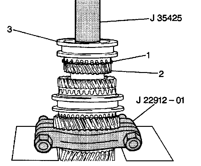27. Use the J 22912-01 in order to support the main shaft. Use the J 35425 and a press arbor in order to install the following components onto the main shaft: