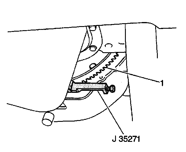 17. Install the torque converter bolts on automatic transmission equipped vehicles. Use the J35271 in order to lock the flywheel (1).