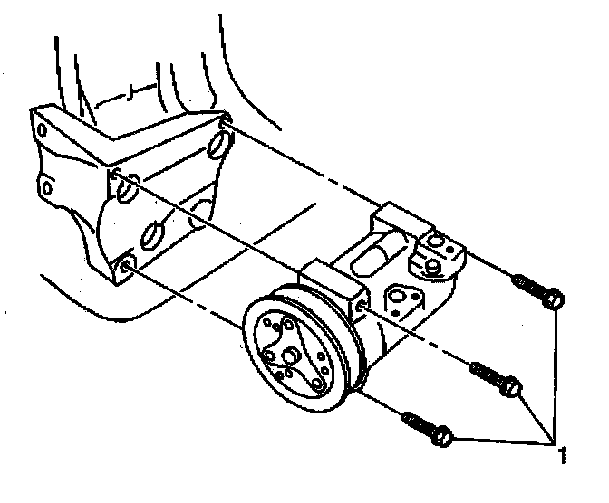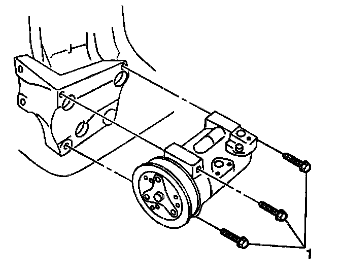 25. Install the A/C compressor to its bracket, if equipped. Secure with 3 bolts (1). Refer to Compressor Replacement.
