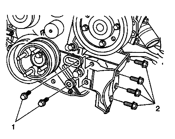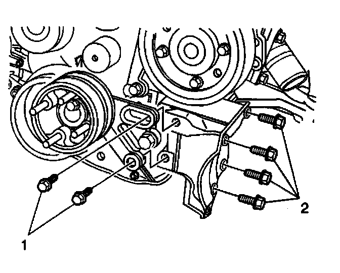 18. Remove the 4 bolts (2) and the A/C compressor bracket, if equipped.