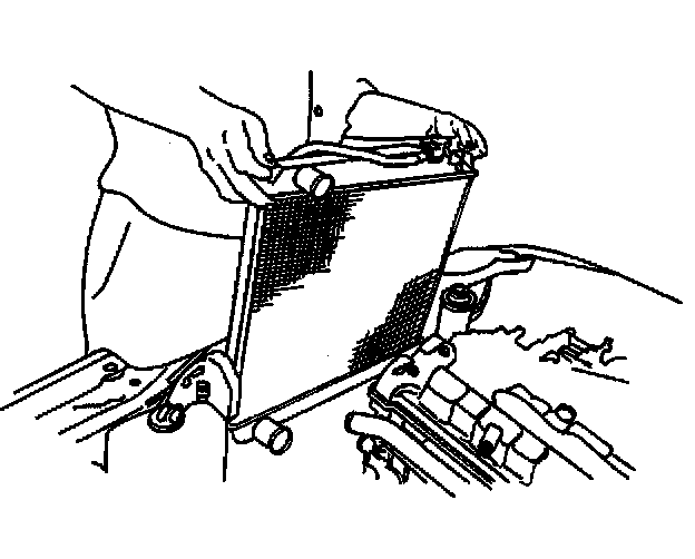 24. Lean the fan shroud toward the engine and lift the radiator up and out of the vehicle.