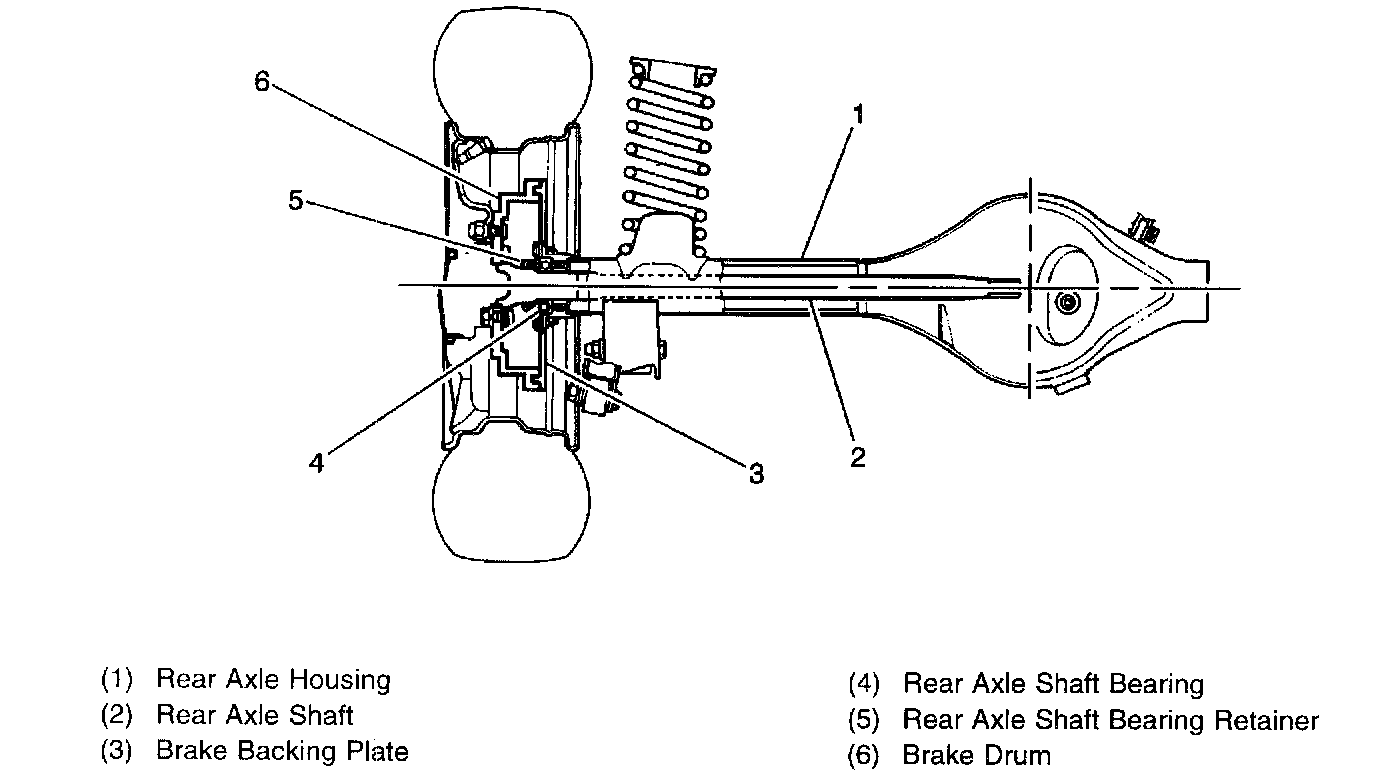 The rear axle assembly contains two rigid axle shafts which transfer engine torque to the rear wheels. These axle shafts (2) are supported in the rear axle housing (1) by bearings (4) at both outer ends, and driven by the differential assembly which is mounted in the center of the rear axle housing. A propeller shaft turns the differential assembly and transfers power to the rear axle shafts. The rear axle housing is sealed and contains a synthetic gear lubricant which lubricates the differential assembly and axle shafts bearings.