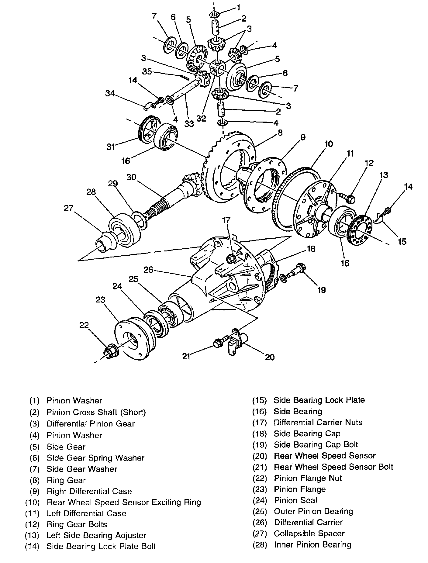 The differential pinion gears are mounted on a pinion cross shaft (8) and are free to rotate on it. The pinion shaft is fitted into a bore in the differential case and is held in place by a pinion shaft roll pin. The differential case is mounted in the differential carrier where the pinion gear drives the ring gear, differential case, and the side and differential pinion gears. The differential carrier is mounted near the center of the rear axle housing. For removal and installation procedures, refer to Differential Carrier Replacement.