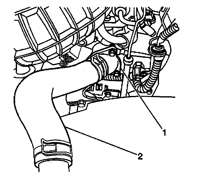 12. Install the upper radiator hose to the thermostat housing (1).