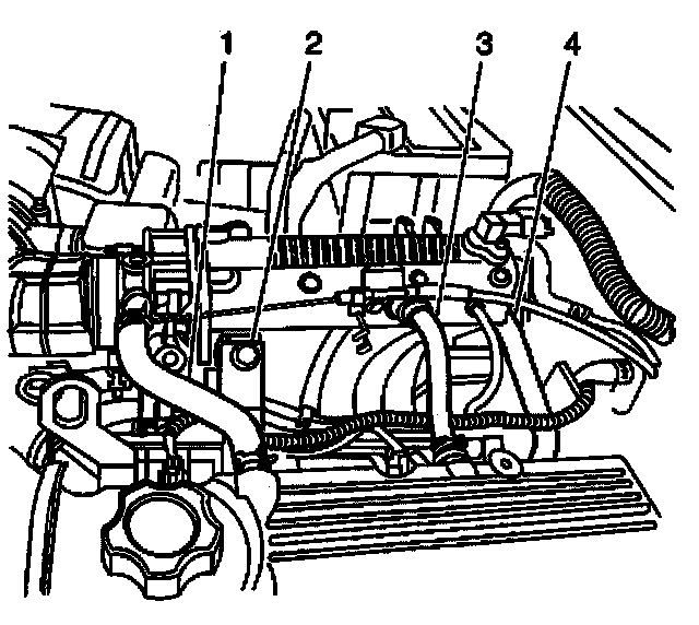24. Remove the two bolts and the upper rear intake manifold support bracket (4) from the intake manifold.