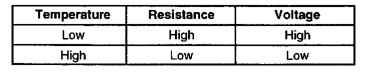 The Engine Coolant Temperature (ECT) sensor (1) is located at the front of the intake manifold, near the thermostat housing. The ECT sensor is a thermistor (a variable resistor that changes value when the temperature changes). The ECT sensor is connected in series with a fixed resistor in the Powertrain Control Module (PCM). The PCM applies 5 volts to the ECT sensor. The PCM monitors the voltage drop across the ECT sensor and converts the voltage reading into a temperature value. The ECT sensor voltage reading at the PCM will vary with the changes in the engine temperature.