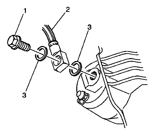 8. Assemble the brake hose bolt (1) and the NEW copper brake hose gaskets (3) to the brake hose (2).