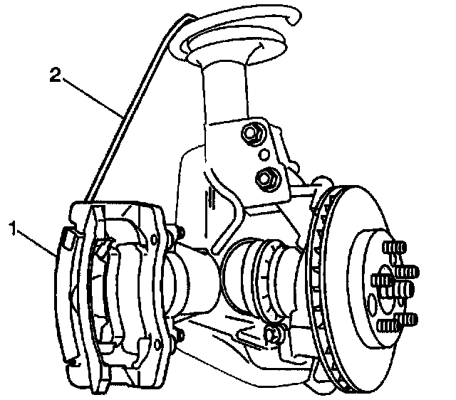 7. Use a strap (2) or heavy gage wire in order to support the brake caliper (1) and the brake caliper bracket.