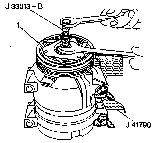 5. Remove the hub and drive plate assembly (1) by turning the center screw into the body of the hub and drive plate installer and against the compressor shaft.