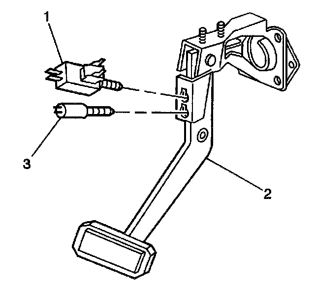 2. Insert the stoplamp switch (1) and the cruise control switch (3) (if equipped) into the brake pedal bracket (2).