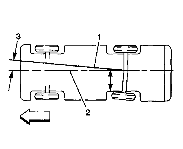 The front wheels aim or steer the vehicle. The rear wheels control tracking. This tracking action relates to the thrust angle (3). The thrust angle is the path that the rear wheels take. Ideally, the thrust angle is geometrically aligned with the body centerline (2).In the illustration, toe-in is shown on the left rear wheel, moving the thrust line (1) off center. The resulting deviation from the centerline is the thrust angle.
