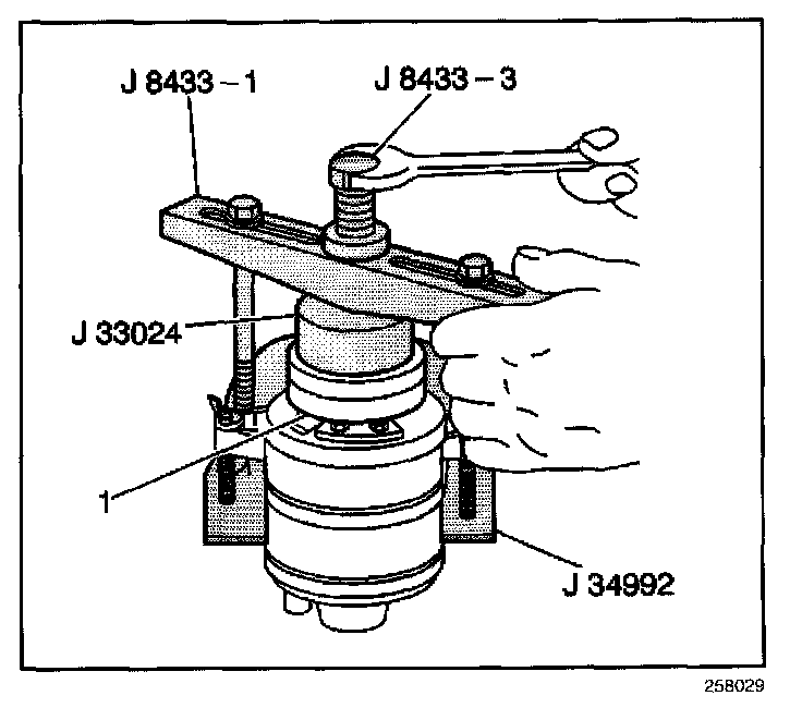 8. Turn the center forcing screw of the J 8433-1 in order to force the clutch coil onto the front head. Ensure that the clutch coil and the J 33024 remain aligned during installation.