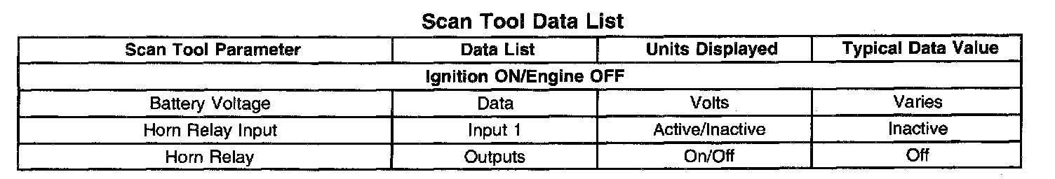 The Horns Scan Tool Data List contains all of the horn related parameters that are available on the scan tool. The parameters in the list are arranged in alphabetical order. The column, "Data List," indicates the location of the parameter within the scan tool menu selections. Use the Horns Scan Tool Data List as directed by a diagnostic table or in order to supplement the diagnostic procedures. Begin all of the diagnostic procedures with Diagnostic System Check - Horns.