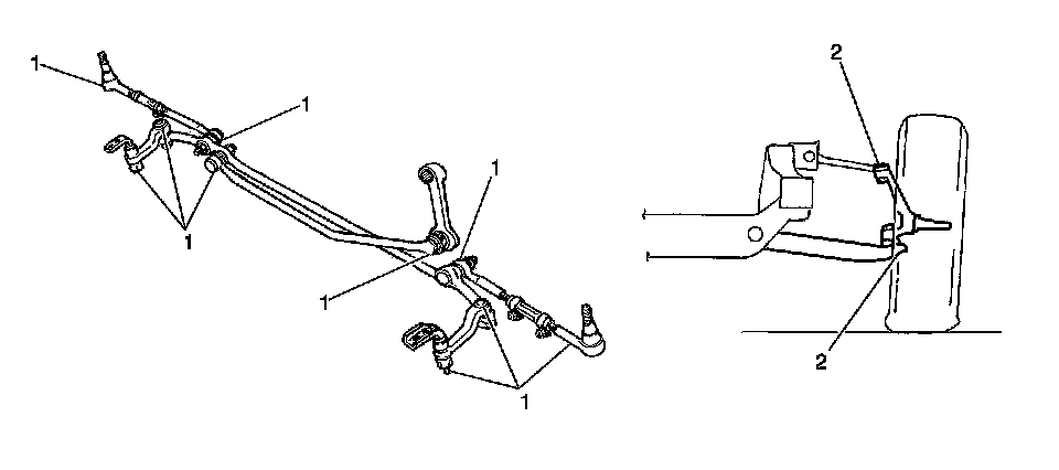 For A4WD, lubricate the steering linkage (1) and the upper and lower ball joint (2).