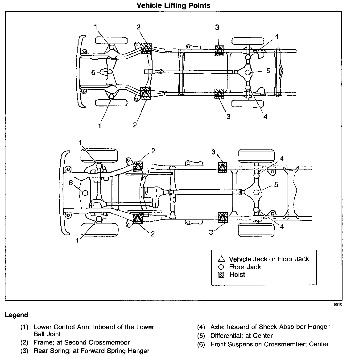 The jack and hoist lift points for the front of the vehicle are located between the front body mounts and the transmission crossmember. The jack and hoist lift points for the rear of the vehicle are located at the front hangers for the rear springs.