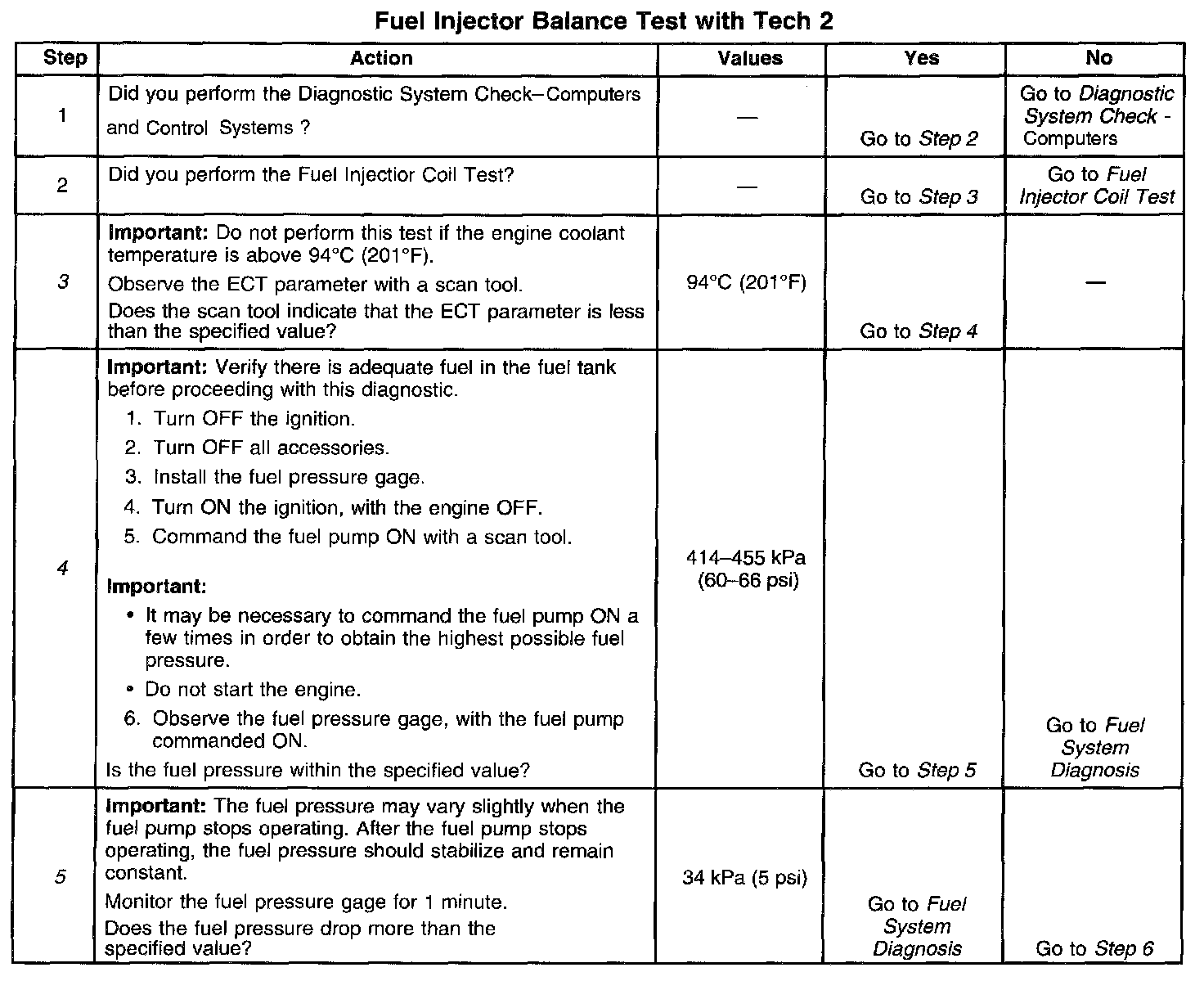4. The fuel pressure should be within the specified range. Refer to Fuel System Diagnosis if the fuel pressure is not within the specified range. Component Tests and General Diagnostics
