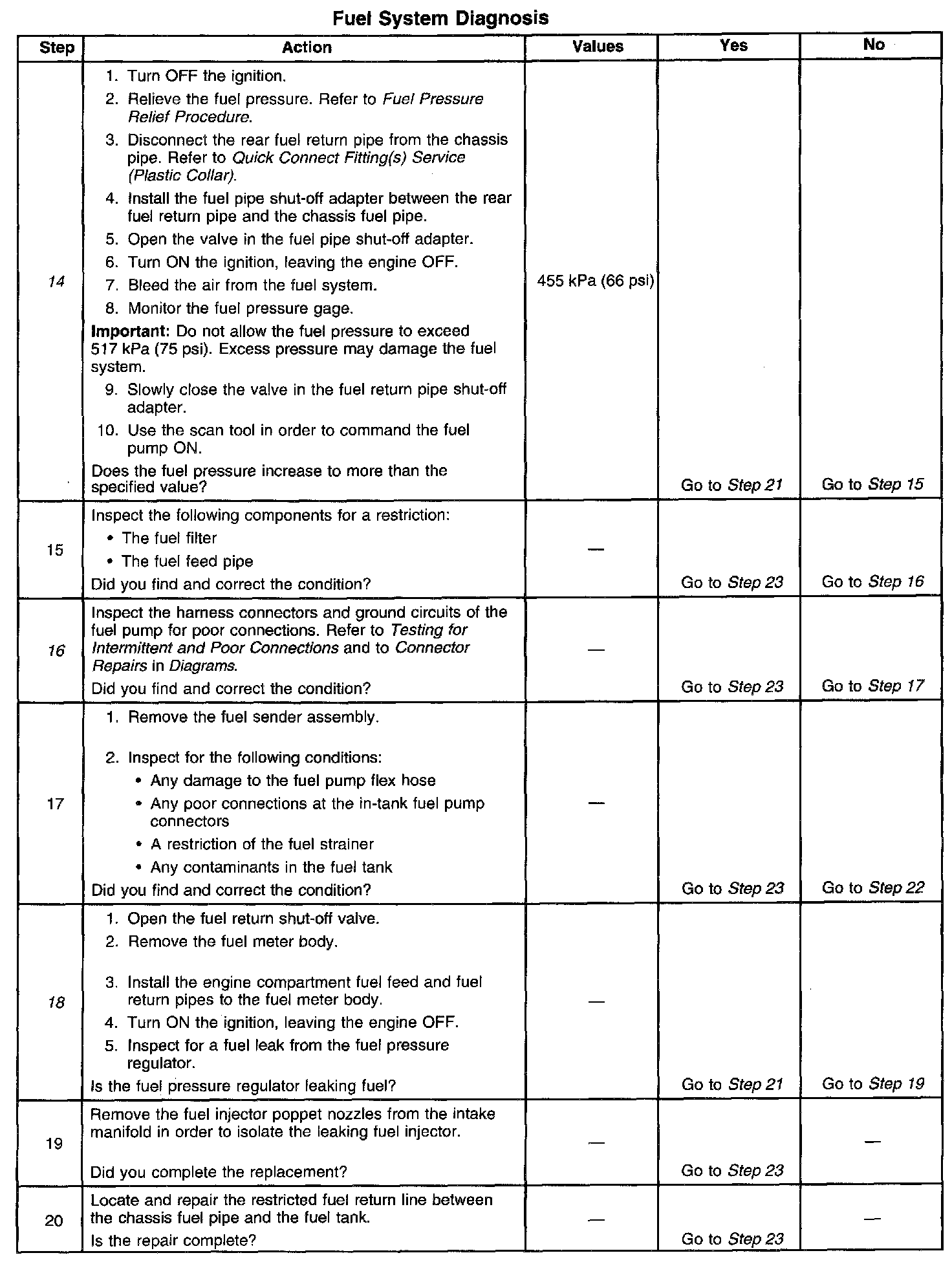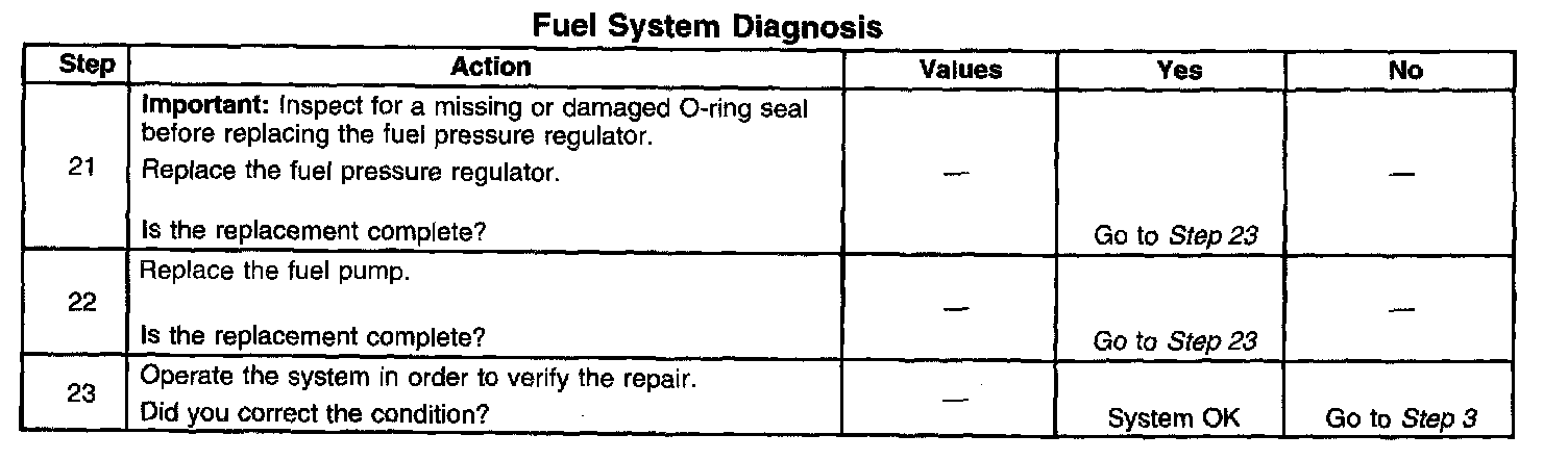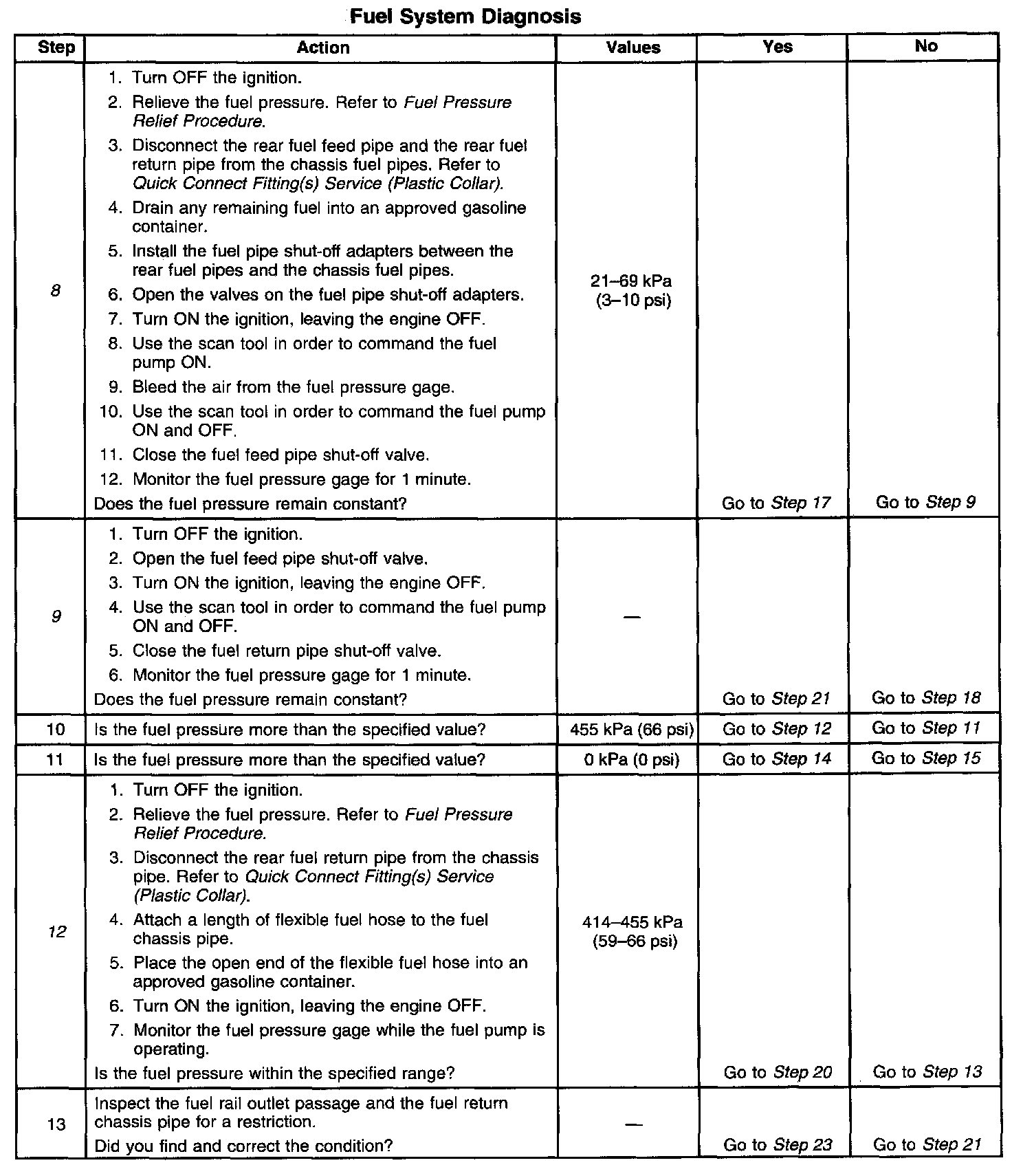 12. This step tests for a restricted fuel return pipe. If the fuel pressure is within the specified values a restriction in the fuel return pipe is indicated.