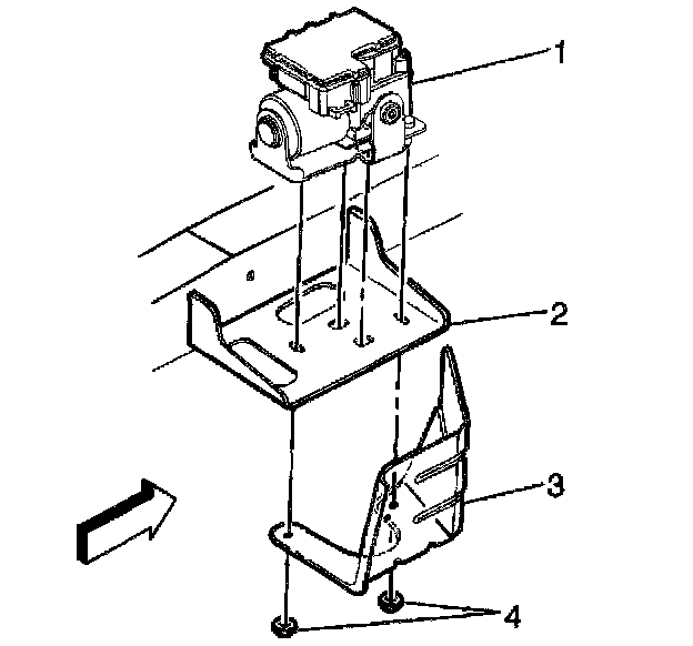 4. Secure the module (1) to the frame bracket (3) and fuel pipe shield (2) with the two nuts (4).