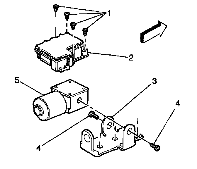 3. Remove the four T 25 Torx(R) mounting screws (1) that fasten the EBCM (2) to the BPMP (5).