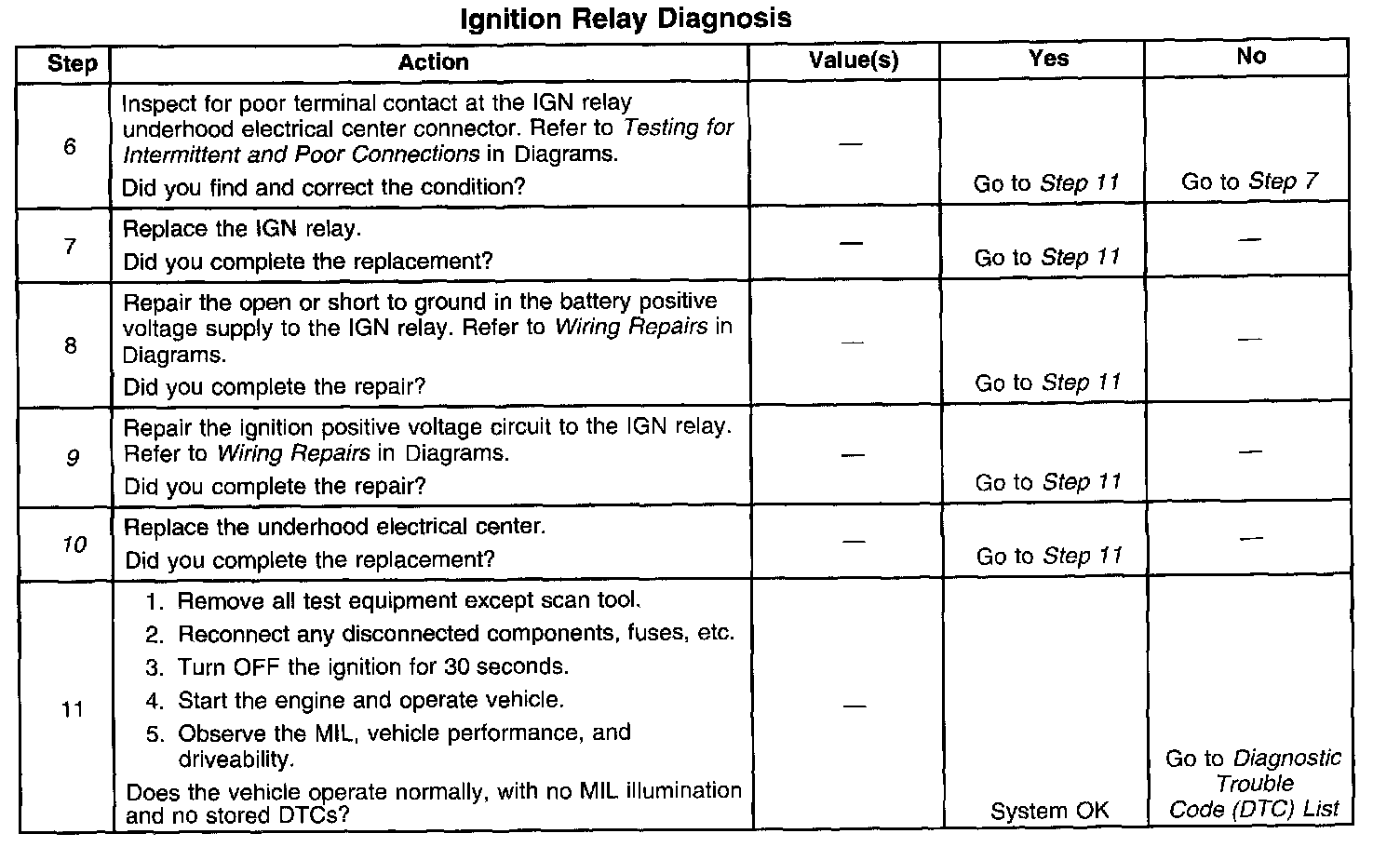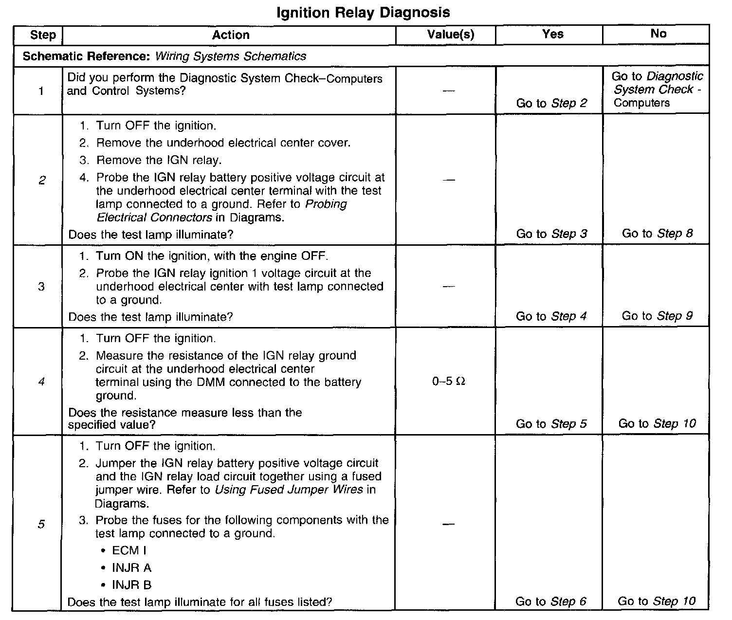 5. This step isolates the circuit from the IGN relay. All of the circuits at the relay are good if the test lamp illuminates.