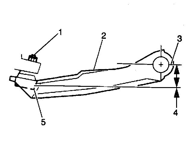 5. Measure from the pivot bolt center line (3) down to the lower corner (5) of the lower ball joint (1 ) in order to obtain the Z height measurement (4).