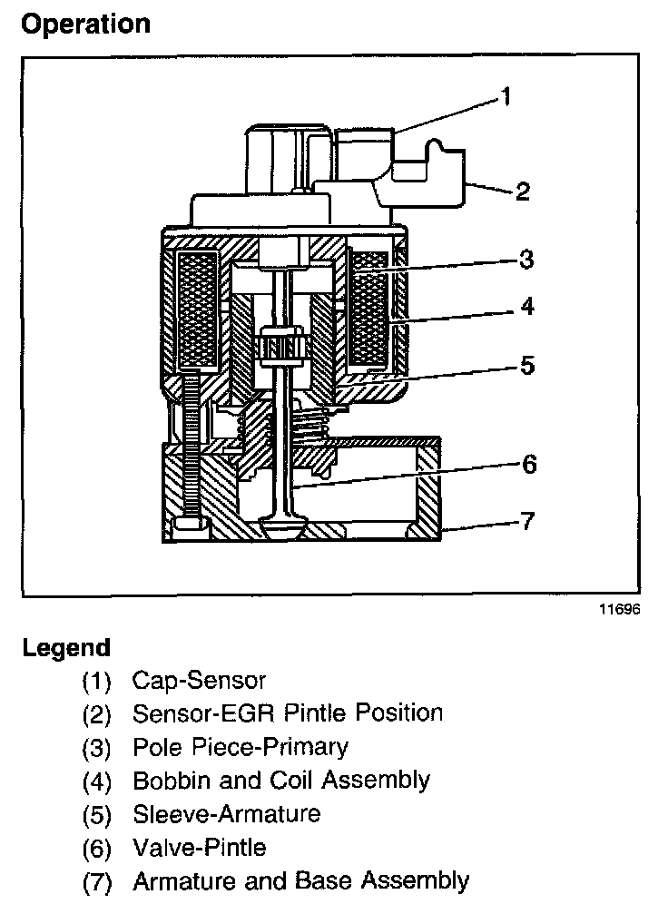 The EGR valve is designed to accurately supply exhaust gases to the engine without the use of intake manifold vacuum. The EGR valve controls the exhaust flow into the intake manifold from the exhaust manifold through an orifice with a Powertrain Control Module (PCM) controlled pintle. The PCM controls the pintle position using inputs from the Engine Coolant Temperature (ECT) sensor, the Throttle Position (TP) sensor, and the manifold absolute pressure (MAP) sensor. The PCM commands the EGR valve in order to supply the correct amount of exhaust gas recirculation for the current engine operating conditions. This can be monitored on a scan tool as the Desired EGR Position.
