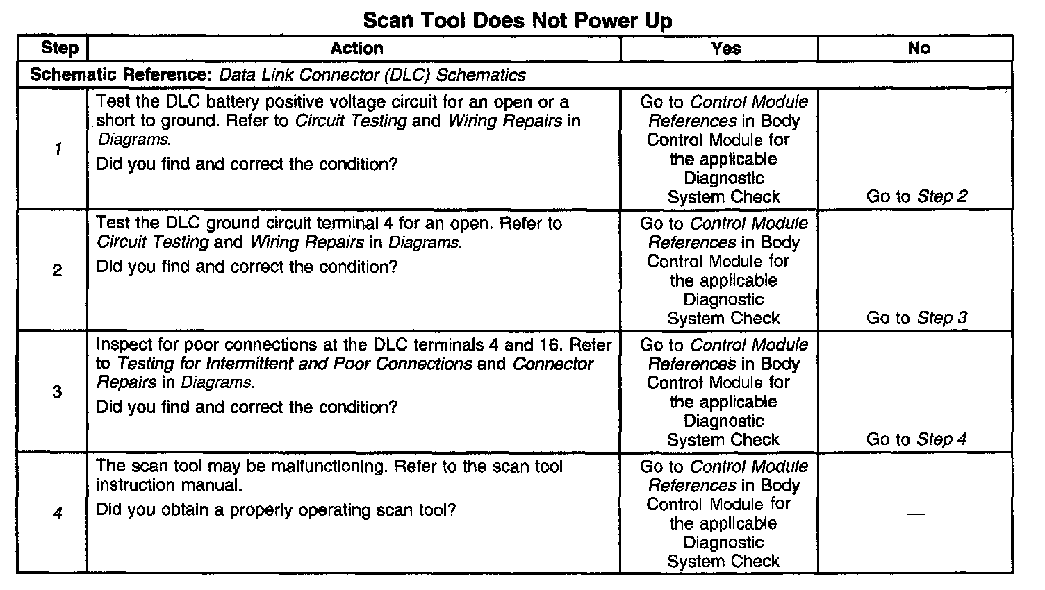 CIRCUIT DESCRIPTIONThe DLC provides battery positive voltage to the scan tool at terminal 16, and ground at terminal 4. The DLC provides the class 2 serial data signal at terminal 2 and signal ground at terminal 5. The scan tool will power up with the ignition OFF.