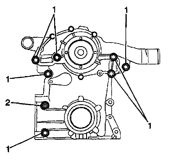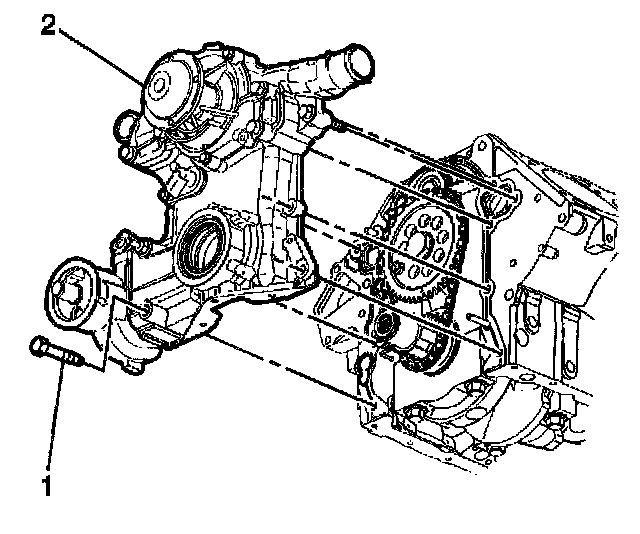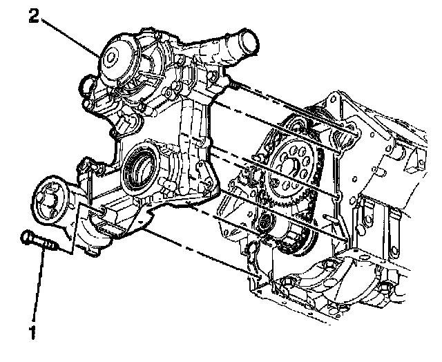 7. Apply sealant GM P/N 12346004 or equivalent to the engine front cover bolts (1) and stud (2).