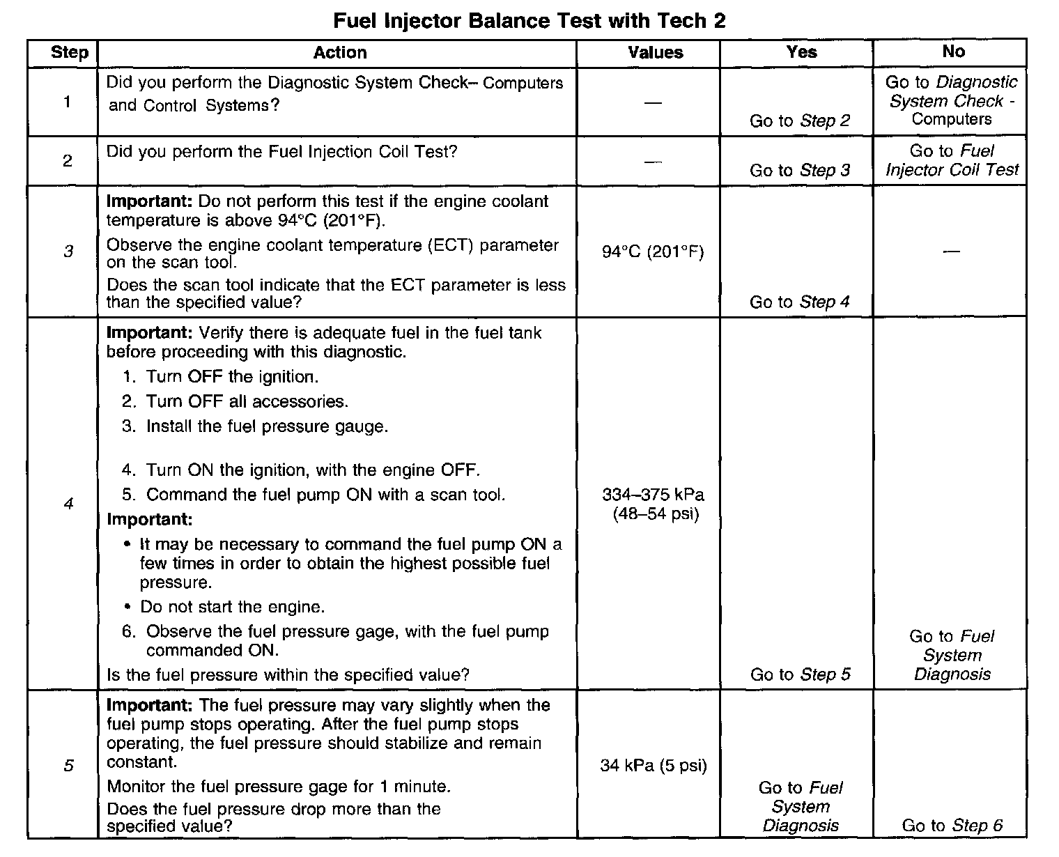 5. The fuel pressure should reach a steady value. Refer to Fuel System Diagnosis if the fuel pressure does not stabilize. Component Tests and General Diagnostics