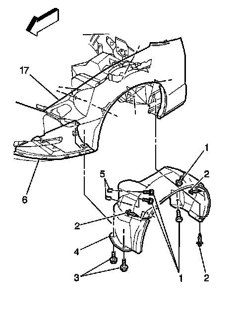 4. Install the wheelhouse panel liner bolts screws (3) to the following components: