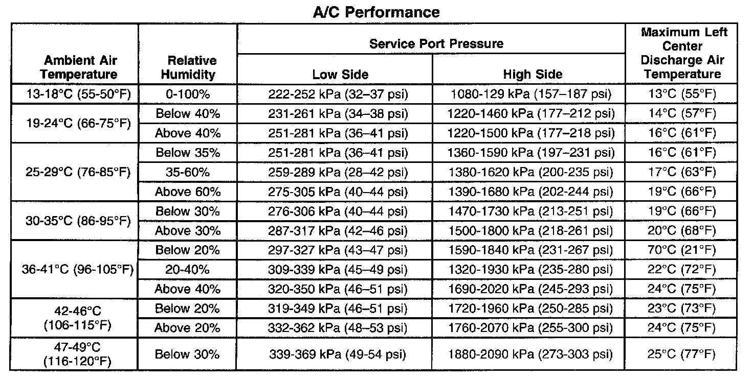 A/C System Performance Table