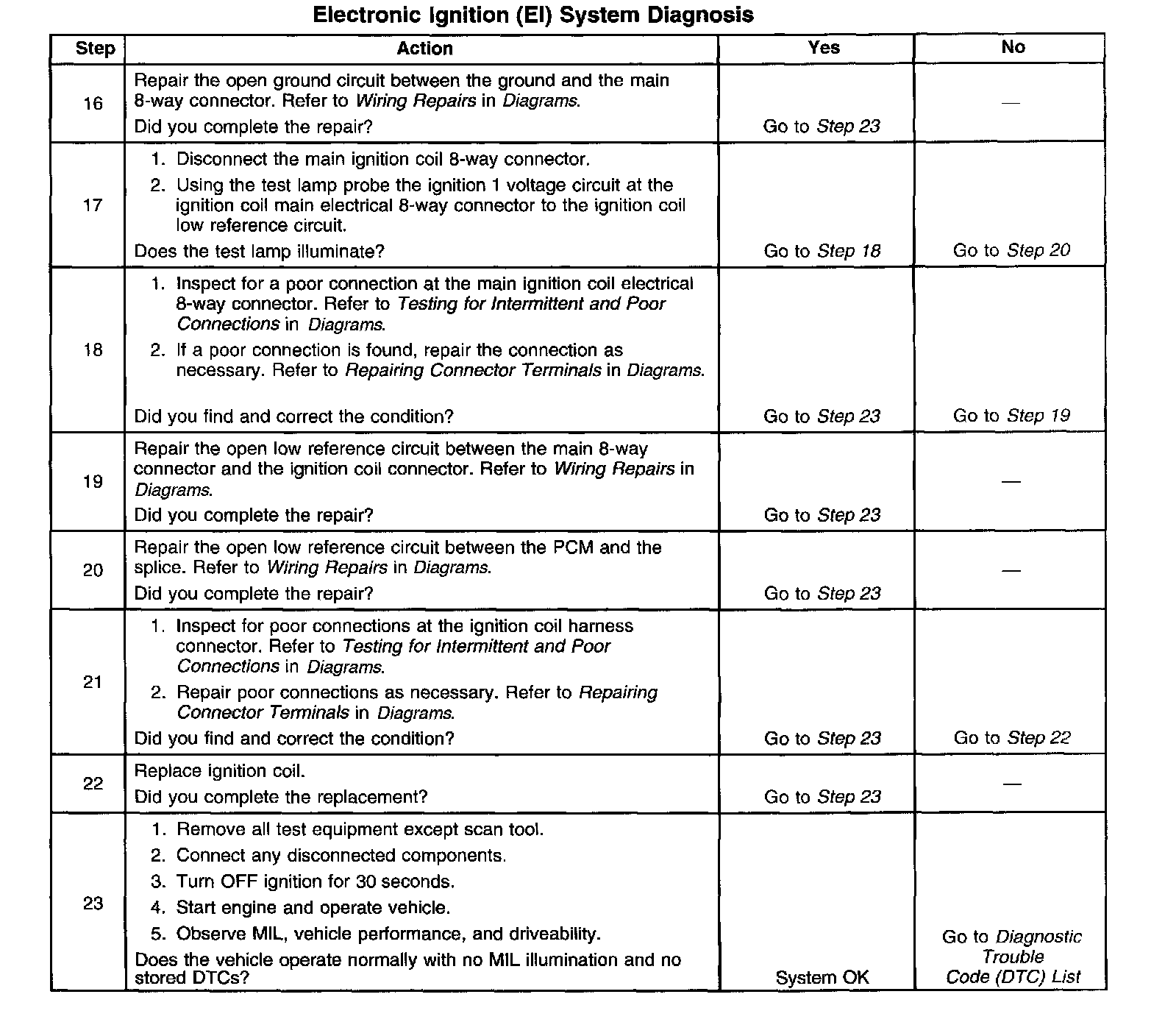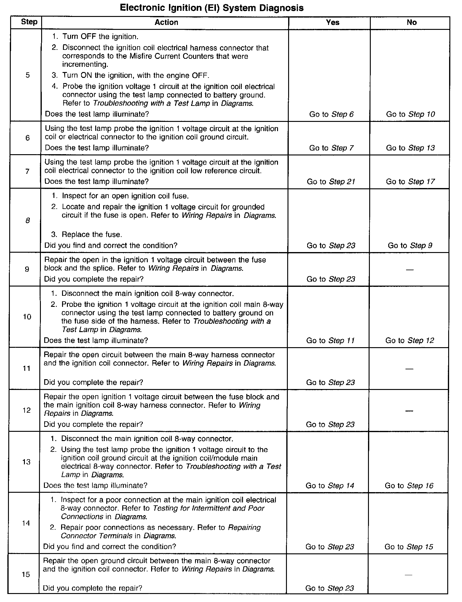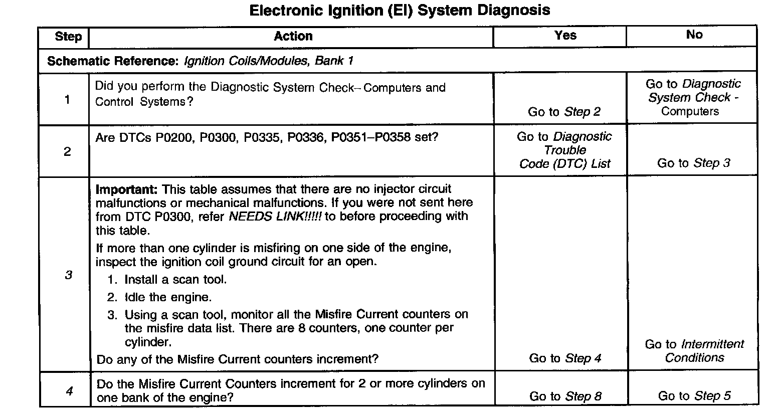 The numbers below refer to the step numbers on the diagnostic table.
