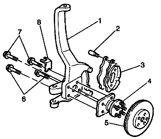 2. Install the wheel bearing hub bolts (6, 7) and wheel speed sensor wire bracket (8).