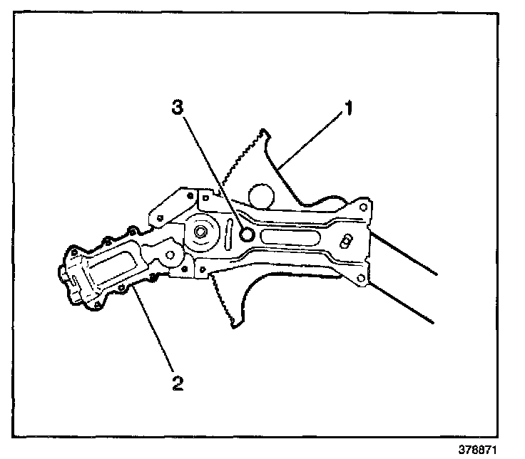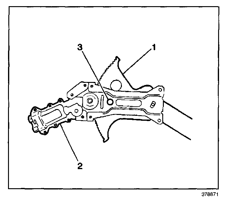 2. Drill hole (3) through window regulator sector gear and backplate.