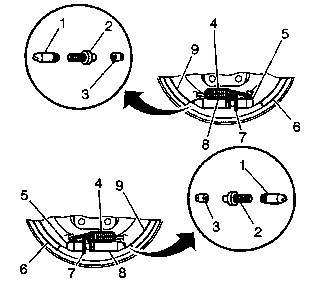 5. Install the parking brake strut (5) and the strut spring (4), by spreading the shoes (17, 29) apart. Verify that the shoes are positioned correctly: