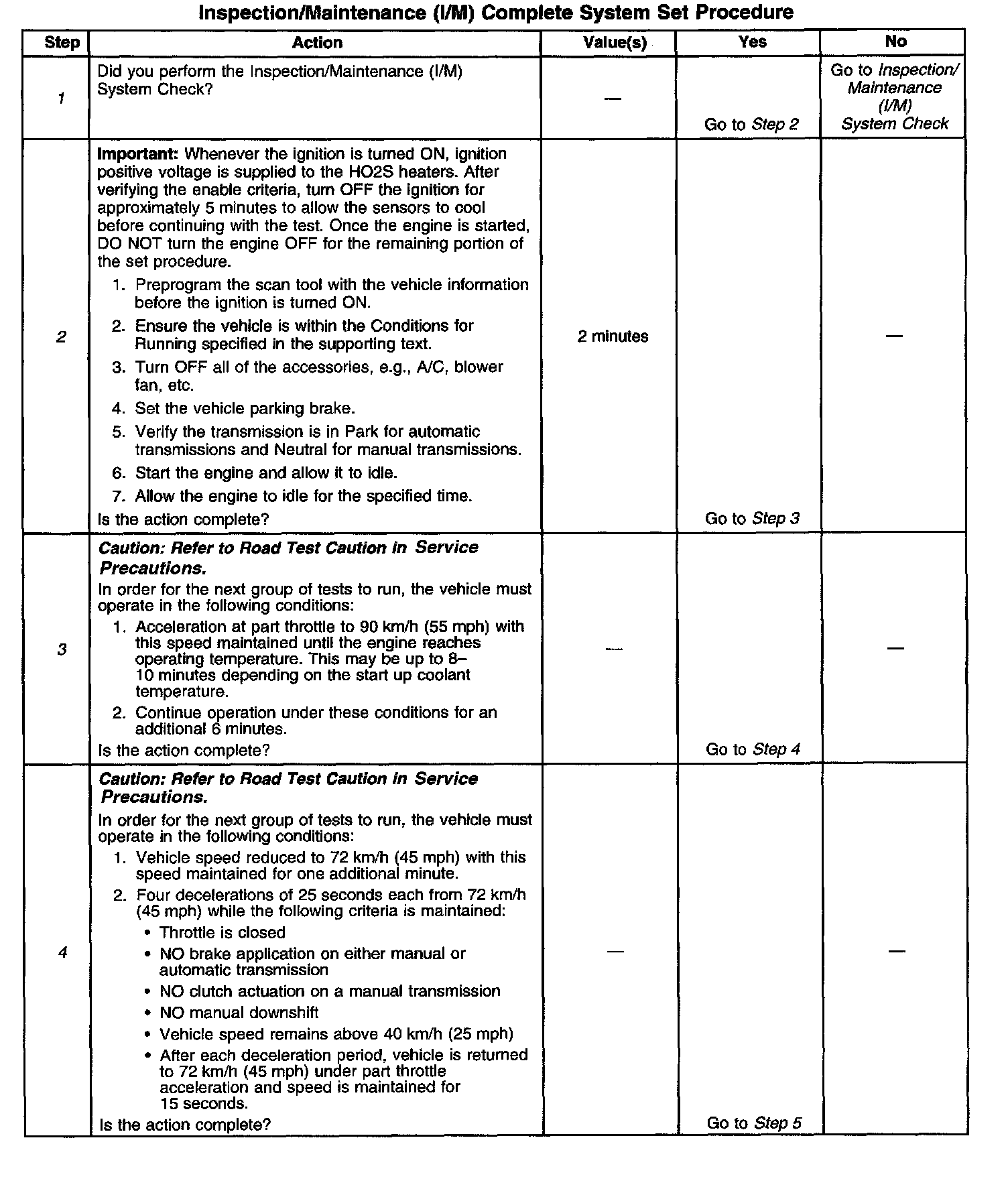 DESCRIPTIONThe purpose of the I/M Complete System Set Procedure is to satisfy the enable criteria necessary to execute all of the I/M readiness diagnostics, and complete the trips for those particular diagnostics. When all diagnostic tests are completed, the I/M System Status indicators are set to YES. Perform this test when more than one or all of the I/M System Status indicators are set to NO.