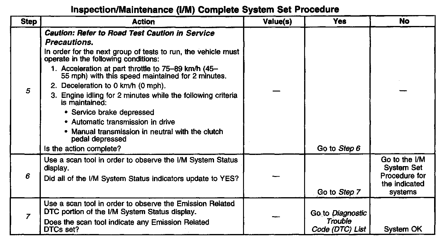 7. The I/M System Status only reports on whether or not a diagnostic has run, not the outcome of the test. If any emission related DTC sets after the tests are complete, the DTC will require diagnosis.