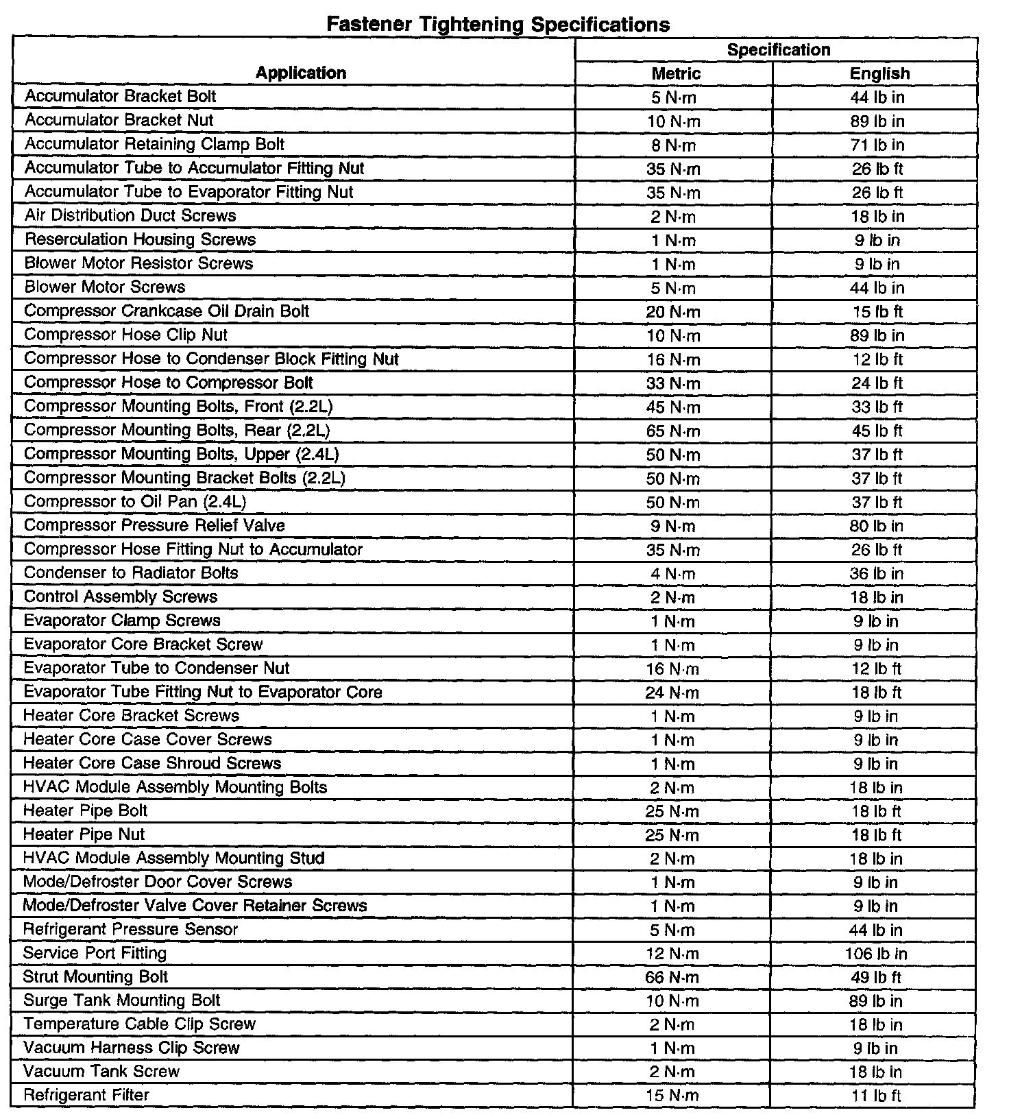 Fastener Tightening Specifications: