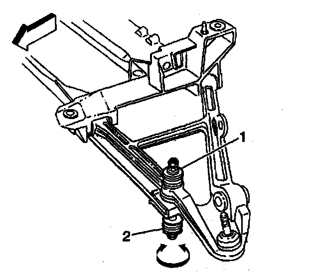 4. Use the J 42854 in order to measure the distance between the lowest point of the ball joint (2) and the center of the front side of the lower control amp mounting bolt (1).