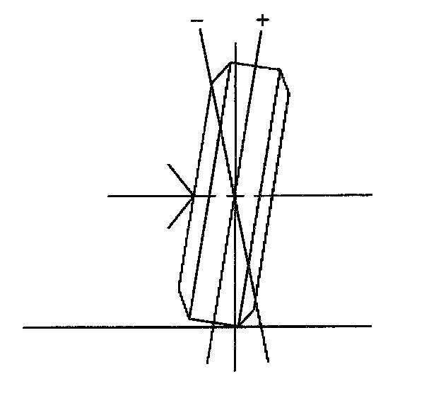 Camber is the tilting of the wheels from the vertical when viewed from the front of the vehicle. When the wheels tilt outward at the top, the camber is positive (+). When the wheel tilts inward at the top, the camber is negative (-). The amount of tilt is measured in degrees from the vertical. Camber settings influence the directional control and the tire wear.