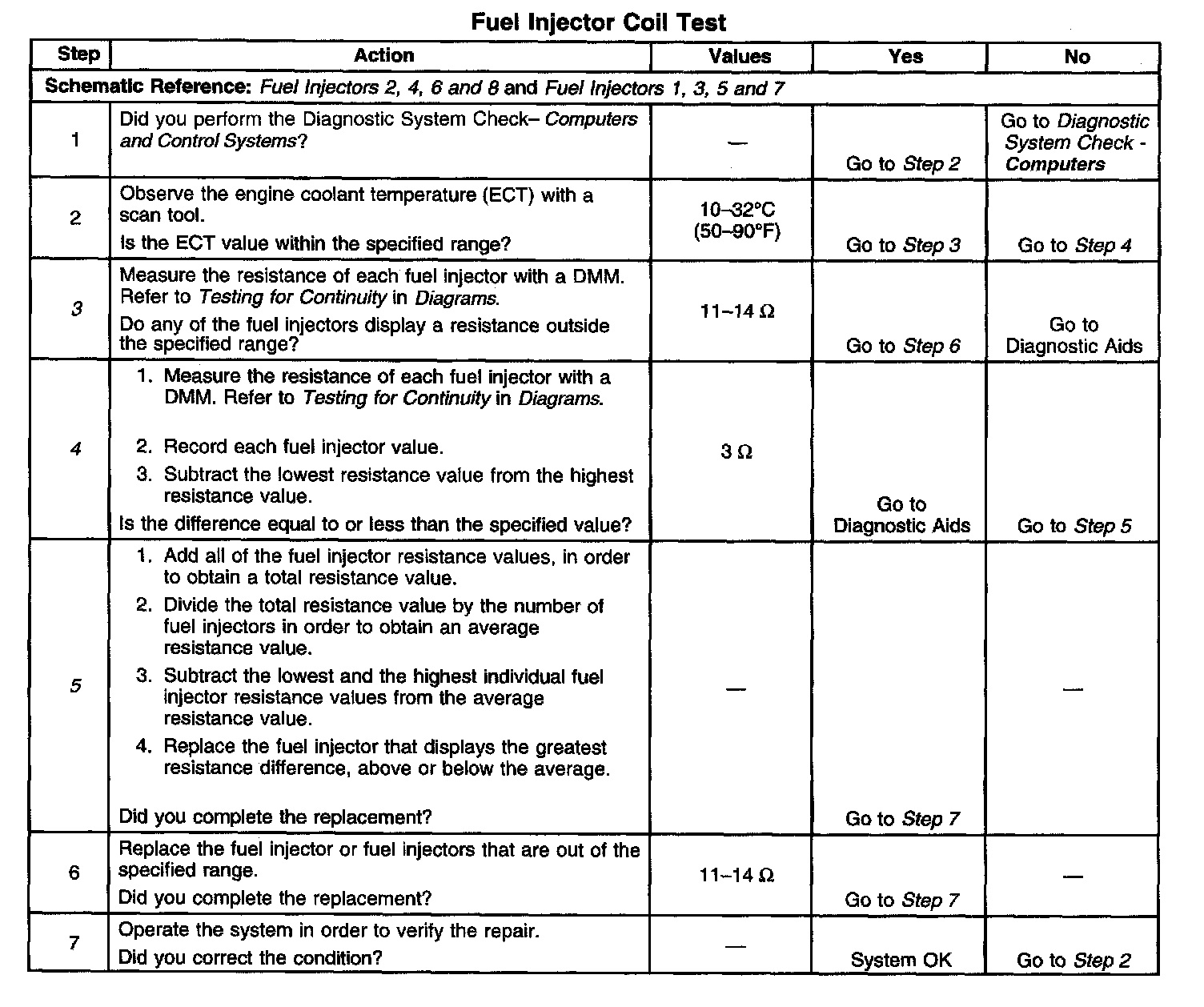 4. This step determines if all of the fuel injectors are within 3 ohms of each other. If the highest resistance value is within 3 ohms of the lowest resistance value, then all of the fuel injector coil windings are OK.