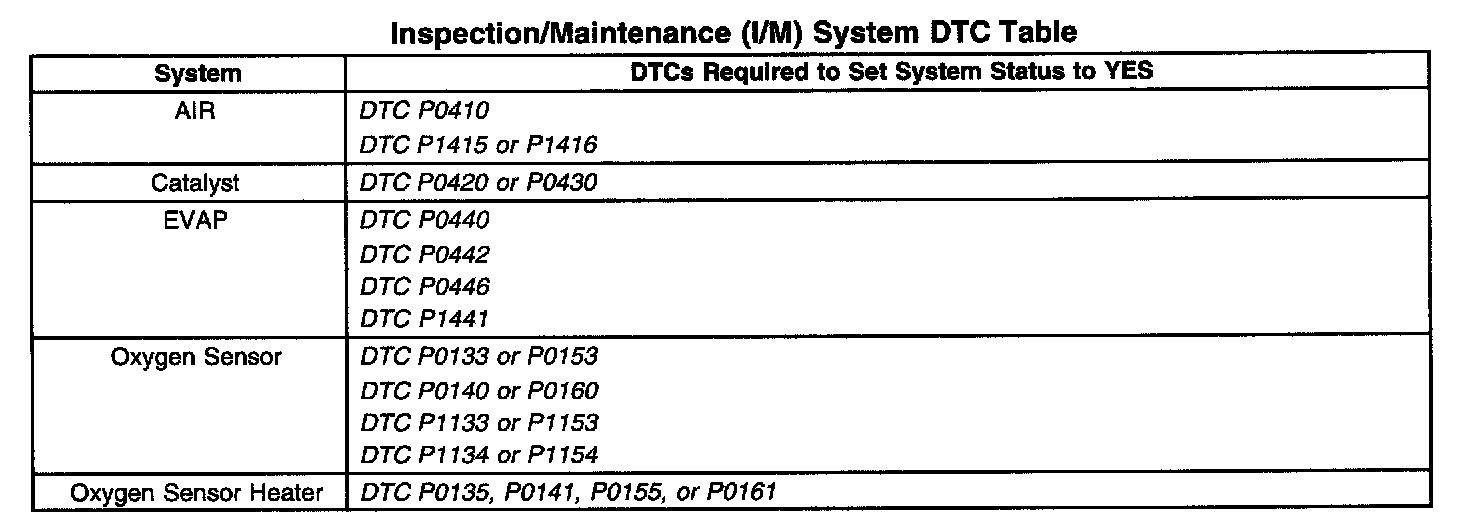 Inspection/Maintenance (I/M) System DTC Table:
