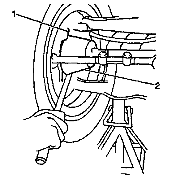 8. Pry between the lower control arm (2) and the outer bearing race (1) while reading the dial indicator. This shows vertical looseness in the ball joints. The lower ball joint is not preloaded and may show some looseness.